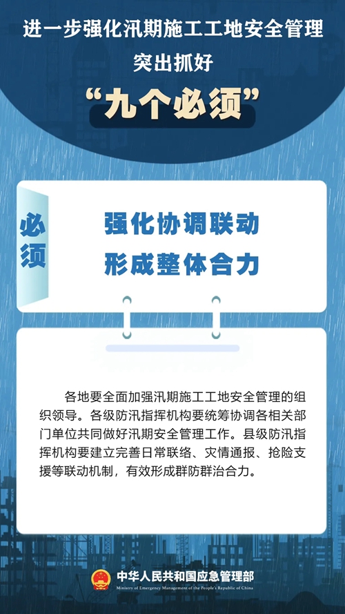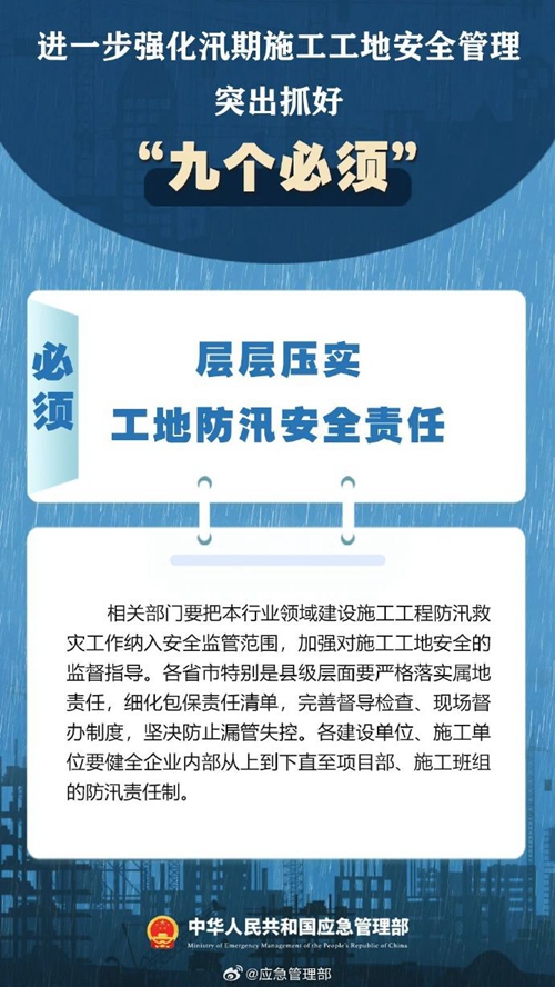 7月9日,國家防災減災救災委員會辦公室印發(fā)緊急通知,進一步強化汛期施工工地安全管理,要突出抓好“九個必須”↓↓ ???
