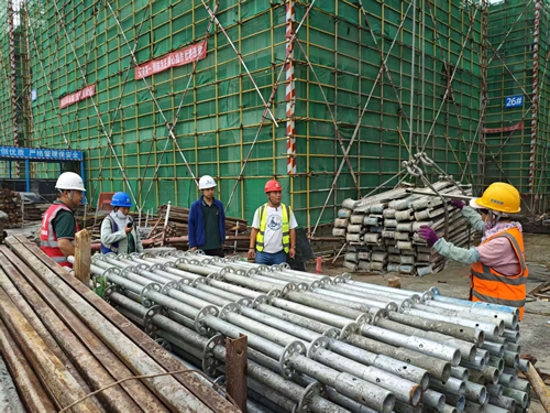 來到3樓頂板上方,工人們正搭建防護網(wǎng)。“他們是這個工作面的開荒者,危險系數(shù)最大。”葉劉杰說,只有防護網(wǎng)搭建完畢,木工、鋼筋工等不同班組才能陸續(xù)入場施工。仔細查看每道工序,并對當(dāng)班工人叮囑一番注意事項后,葉劉杰才放心離開。
