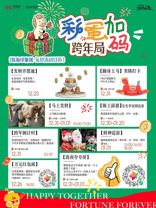 12月31日-1月3日,憑快樂(lè)幣可免費(fèi)騎小馬、抽獎(jiǎng)、兌換零食禮包,輕松實(shí)現(xiàn)童趣與味蕾雙重滿足。跨年夜,商場(chǎng)營(yíng)業(yè)時(shí)間延長(zhǎng)至23:00后自然閉店,大屏同步跨年倒計(jì)時(shí),和親友一起在歡呼聲中迎接2026,氛圍感直接拉滿!