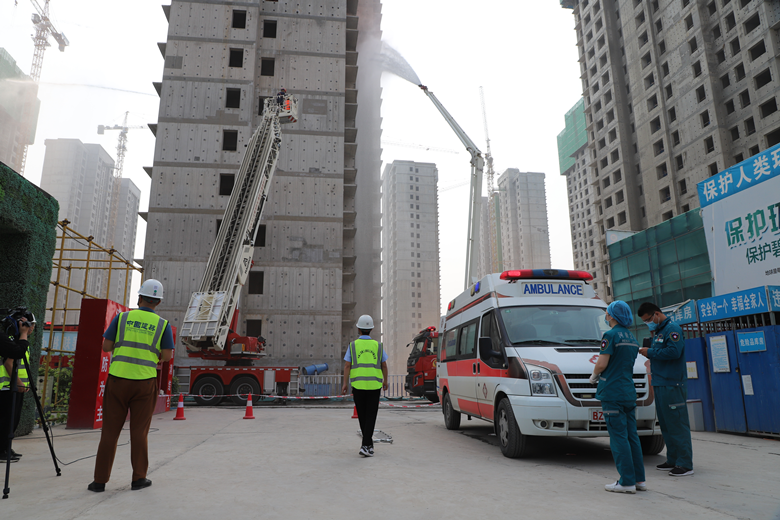 啟動儀式上,在工地現(xiàn)場開展了消防救援應(yīng)急演練。該環(huán)節(jié)模擬施工現(xiàn)場發(fā)生火災(zāi)時,現(xiàn)場管理人員應(yīng)急操作反應(yīng)及配合市消防救援支隊展開滅火救援的案例。演練現(xiàn)場火災(zāi)模擬真實生動,4部消防車、1部救援車、1部救護車實地奔赴現(xiàn)場開展滅火及救援。整個演練過程現(xiàn)場組織嚴密、人員到位快速、操作程序得當(dāng),達到了預(yù)期效果。宣誓環(huán)節(jié),由中建二局三公司代表引領(lǐng)各參賽單位代表共同開展安全宣誓。趙新中為各參賽單位授旗。