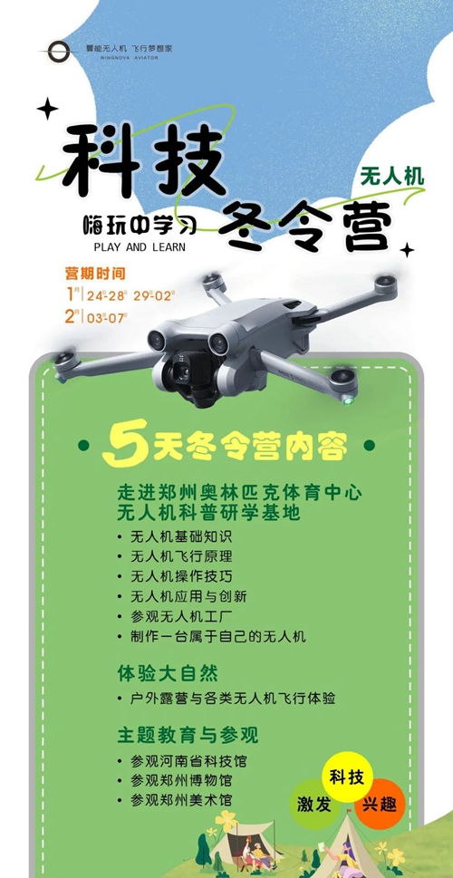 鄭州奧體翼能無(wú)人機(jī)研學(xué)基地是集無(wú)人機(jī)科普、研學(xué)、開(kāi)發(fā)、應(yīng)用、賽事運(yùn)營(yíng)的綜合服務(wù)平臺(tái),不僅擁有1000余平方米的無(wú)人機(jī)科普教育基地,還擁有無(wú)人機(jī)駕駛執(zhí)照的培訓(xùn)資格。寒假期間,依托鄭州奧體中心開(kāi)闊場(chǎng)館,翼能無(wú)人機(jī)將科普知識(shí)與實(shí)操表演完美結(jié)合,分別開(kāi)設(shè)1至5天不等的科技冬令營(yíng),代領(lǐng)孩子們放飛科技?jí)?,在嗨玩中學(xué)習(xí)。