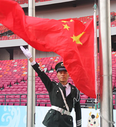 伴隨著慷慨激昂的義勇軍進行曲,五星紅旗冉冉升起,鄭州奧體中心全體員工莊嚴(yán)的向國旗行注目禮,以最崇高的方式表達對祖國母親的敬愛之情。