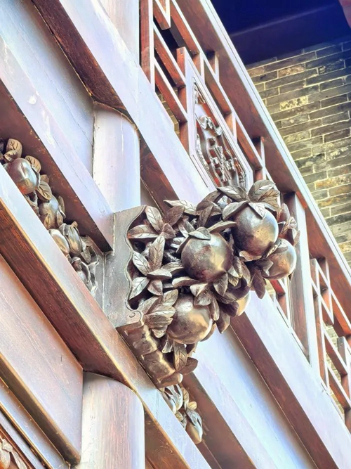 進(jìn)入北門,首先映入眼簾的是16號樓,其主題為壽桃,主題來源于信陽鄧穎超祖居,祖居繡樓內(nèi)部裝飾有壽桃石雕,我們便選取此圖案進(jìn)行創(chuàng)作,在16號樓的墀頭、雀替、卡子花處均有精美的壽桃紋樣。