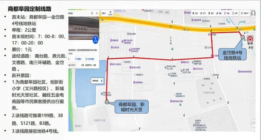專線開通后,商都阜園項(xiàng)目租戶及業(yè)主實(shí)現(xiàn)了“出門即坐上公交,下車即地鐵口”的通勤效率新格局。線路途徑南臺(tái)路、鼎元街文德路、南三環(huán)輔路;中途包含超市、理發(fā)店、小商品城等便民商業(yè)點(diǎn)。無論是上班還是購物,都能享受到高效、舒適的出行體驗(yàn)。線路單程2公里,除直達(dá)地鐵口外也可換乘199路、38路、S121路、B3路。不僅解決了租戶的通勤難題,也為周邊社區(qū)居民提供了便利,得到了大家的一致好評(píng)。