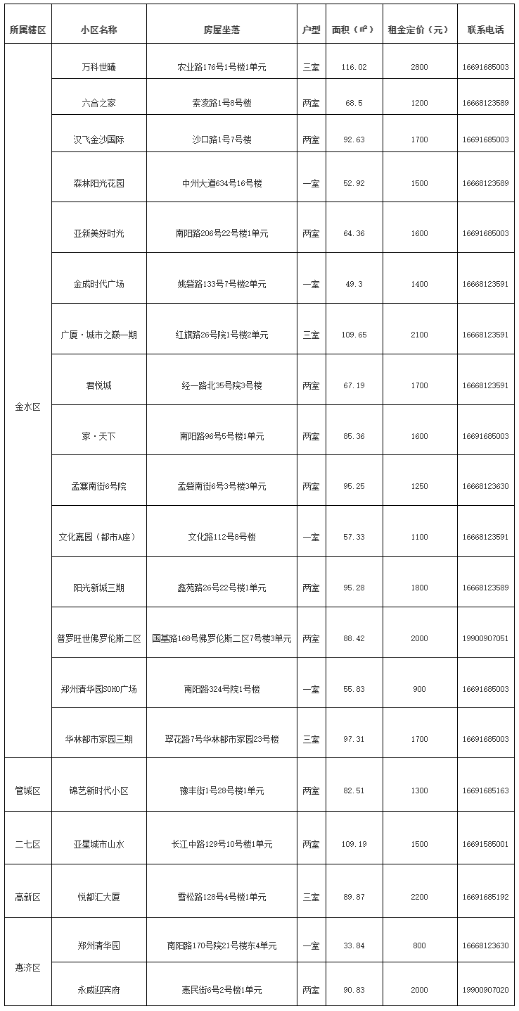 金水區(qū)15套配租房源所在小區(qū)包括萬科世曦、六合之家、漢飛金沙國際、森林陽光花園、亞新美好時光、金成時代廣場、廣廈·城市之巔一期、君悅城、家·天下、孟寨南街6號院、文化嘉園(都市A座)、陽光新城三期、普羅旺世佛羅倫斯二區(qū)、鄭州清華園SOHO廣場、華林都市家園三期。