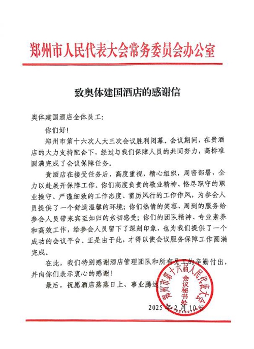 2025年2月10日,鄭州市第十六屆人民代表大會第三次會議第二次全體會議勝利閉幕。鄭州城市發(fā)展集團(tuán)旗下河南鄭地奧體建國飯店作為本次大會的駐地保障酒店,以“五星”服務(wù)標(biāo)準(zhǔn)(環(huán)境舒心、食宿貼心、細(xì)節(jié)暖心、保障安心、文化潤心),圓滿完成了各項(xiàng)接待任務(wù),贏得了與會代表和會務(wù)組的一致好評。