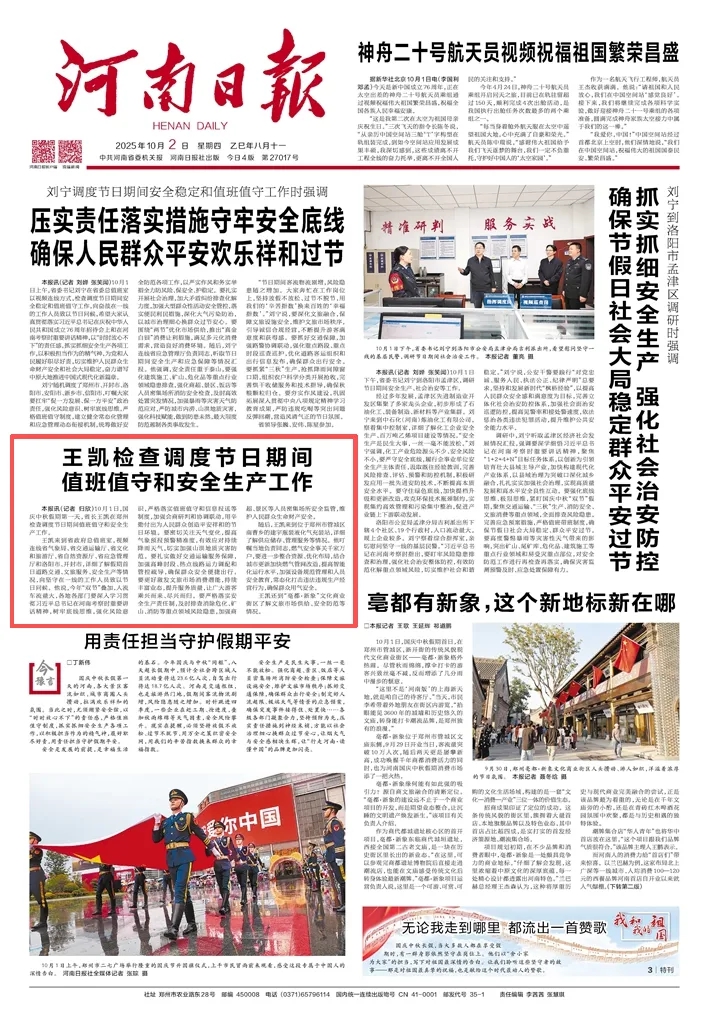 王凱來到省政府總值班室,視頻連線省氣象局、省交通運(yùn)輸廳、省文化和旅游廳、省自然資源廳、省應(yīng)急管理廳和洛陽市、開封市,詳細(xì)了解假期首日道路交通、文旅服務(wù)、安全生產(chǎn)等情況,向堅(jiān)守在一線的工作人員致以節(jié)日問候。他說,今年“雙節(jié)”疊加,人流車流量大,各地各部門要深入學(xué)習(xí)貫徹習(xí)近平總書記在河南考察時(shí)重要講話精神,樹牢底線思維,強(qiáng)化風(fēng)險(xiǎn)意識(shí),嚴(yán)格落實(shí)值班值守和信息報(bào)送等制度,加強(qiáng)會(huì)商研判和協(xié)調(diào)聯(lián)動(dòng),用辛勤付出為人民群眾創(chuàng)造平安祥和的節(jié)日環(huán)境。要密切關(guān)注天氣變化,提高氣象預(yù)報(bào)預(yù)警精準(zhǔn)度,有效應(yīng)對(duì)持續(xù)降雨天氣,切實(shí)加強(qiáng)山洪地質(zhì)災(zāi)害防范。要扎實(shí)做好交通運(yùn)輸服務(wù)保障,加強(qiáng)高峰時(shí)段、熱點(diǎn)線路運(yùn)力調(diào)配和管控疏導(dǎo),確保群眾安全便捷出行。要更好激發(fā)文旅市場(chǎng)消費(fèi)潛能,持續(xù)豐富業(yè)態(tài),提升服務(wù)質(zhì)量,讓廣大游客乘興而來、盡興而歸。要嚴(yán)格落實(shí)安全生產(chǎn)責(zé)任制,及時(shí)排查消除危化、礦山、消防等重點(diǎn)領(lǐng)域風(fēng)險(xiǎn)隱患,加強(qiáng)商超、景區(qū)等人員密集場(chǎng)所安全監(jiān)管,維護(hù)人民群眾生命財(cái)產(chǎn)安全。