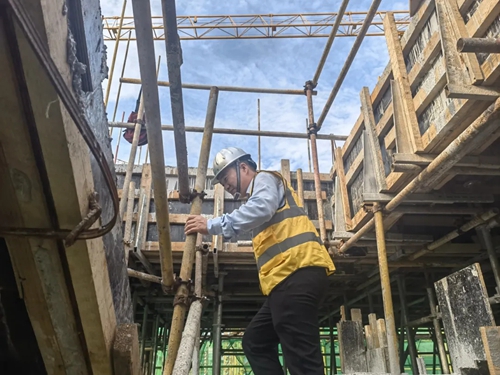 來到3樓頂板上方,工人們正搭建防護網(wǎng)。“他們是這個工作面的開荒者,危險系數(shù)最大。”葉劉杰說,只有防護網(wǎng)搭建完畢,木工、鋼筋工等不同班組才能陸續(xù)入場施工。仔細查看每道工序,并對當(dāng)班工人叮囑一番注意事項后,葉劉杰才放心離開。
