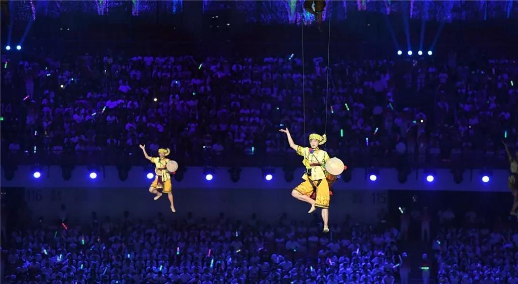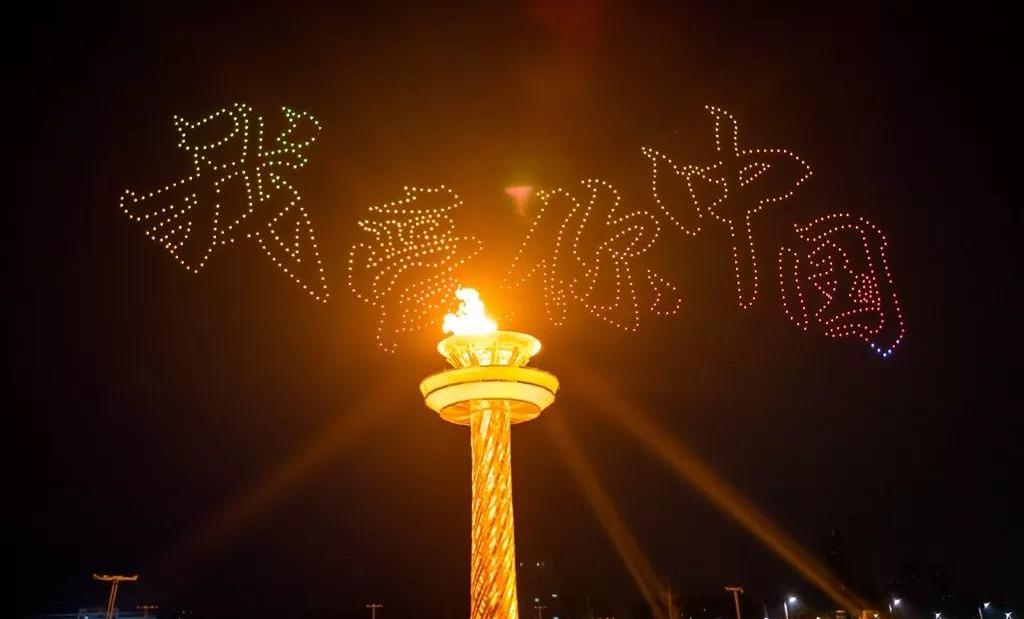 當(dāng)現(xiàn)場屏幕通過虛擬技術(shù)應(yīng)用,呈現(xiàn)出美麗的畫面,讓現(xiàn)場觀眾仿佛置身北國北川、南嶺飛瀑之中,觀眾都情不自禁地?fù)]舞起了手中的國旗為他們的表演喝彩!為我們偉大的祖國喝彩!1000架無人機(jī)從奧體中心廣場升起迅速變換成中中的造型,點(diǎn)燃民族運(yùn)動(dòng)會的火炬。